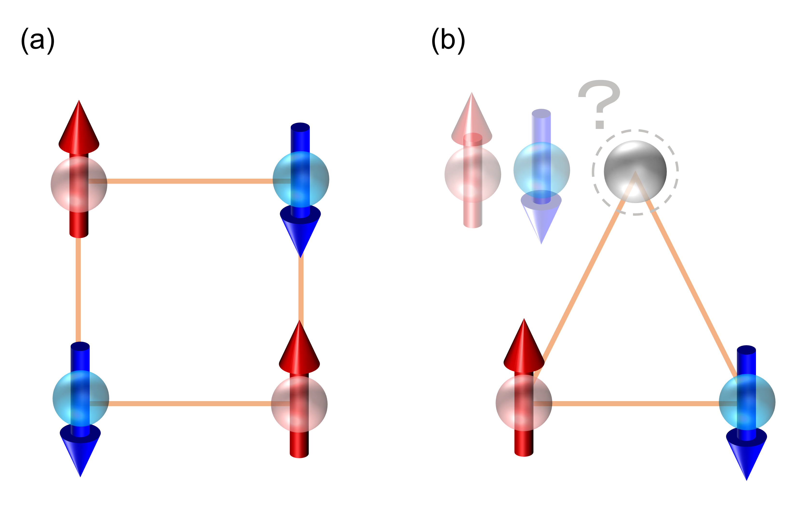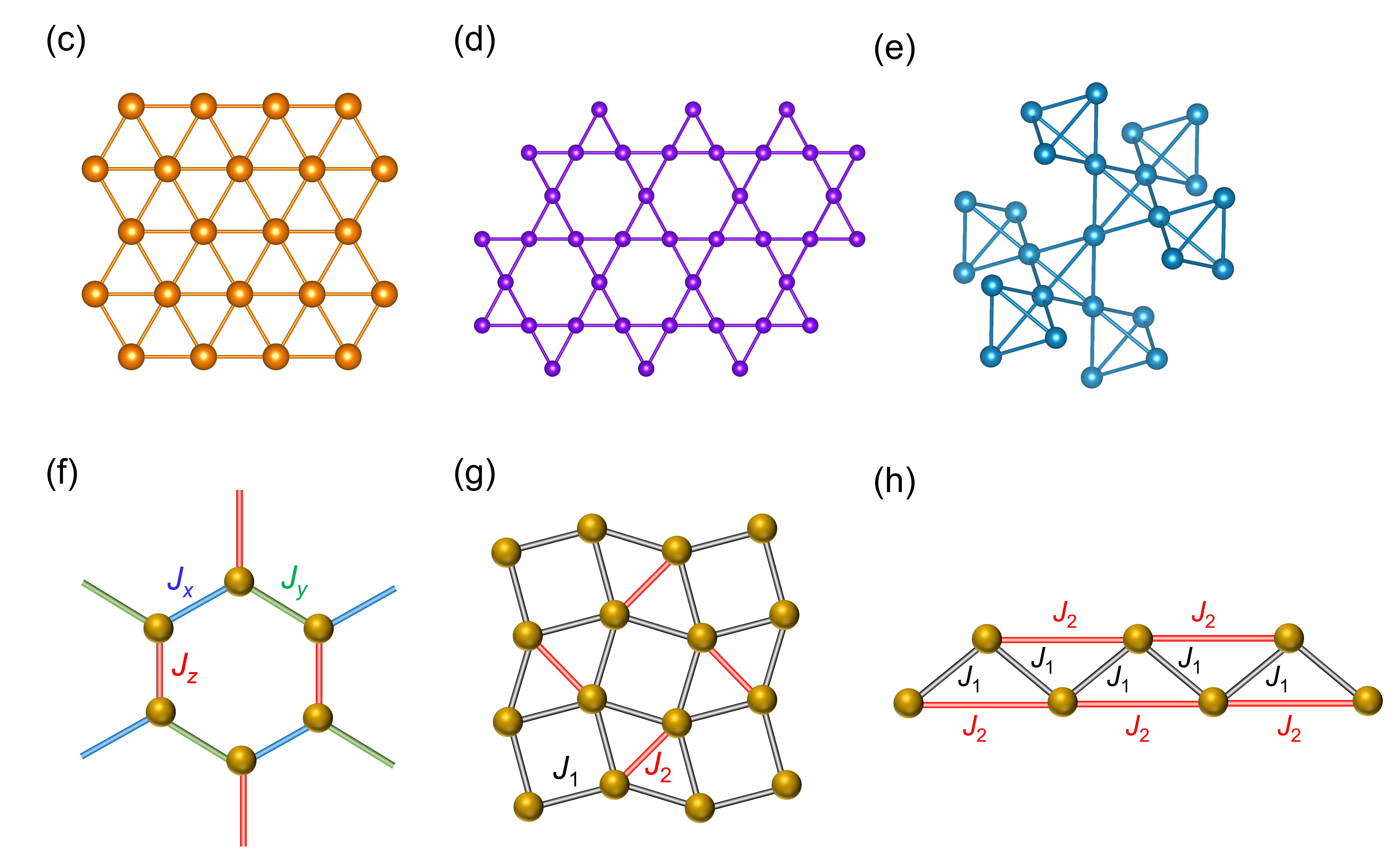 「フラストレーション」って言葉は、欲求が何らかの障害によって阻止され、満足されない状態のことを意味します。コロナ禍の緊急事態宣言では、満足てきていた人もいれば、フラストレーションが溜まっていた人もいると思います。みんなが満足できる対策ってなかなか難しいですよね...。 それと同じように、物質中の電子スピンも、みんなが同時に満足できないような(フラストレートした)状態が生じる場合があります。ここでいう「満足できない」、というのは「相互作用のエネルギーを最も得する配置を選べることができない」という意味です。図のようにスピン間に反強磁性的な(隣り合うスピンが反対方向を向く)交換相互作用 がはたらく2つのイジングモデル(a), (b)を考えます。(a)のようにスピンが四角形の格子点に位置してる場合、全ての隣り合うスピンが反平行($\uparrow$,$\downarrow$)に揃った構造をとることができます。一方で、(b)のようにスピンが三角形の格子点に位置してる場合は、2つのスピンを反平行に置くと残りのスピンはどの方向を向いてもエネルギーが変わらないので、安定な配置が決まりません。このように、幾何学的配置や相互作用の競合によって、すべての相互作用エネルギーを最低にすることができない状況を物理学では「フラストレーション」といいます。フラストレーションをもつ量子スピン系(フラストレート系)の例としてとしては、(c)三角格子、(d)カゴメ格子、(e)パイロクロア格子、(f)ハニカム格子、(g)シャストリーサザランド格子、(h)一次元ジグザグ鎖などです。フラストレート系では磁気秩序(周期的なスピンの配列)が抑制されて、通常の磁性体で実現しないような基底状態(量子スピン液体相、Valence-Bond-Solid相、Spin-Nematic相など)や準粒子 *(スピノン、磁気モノポール、マヨラナ粒子、エニオン、トリプロンなど)を示す場合があるので、現在もなお実験理論問わず盛んに研究が行われています。