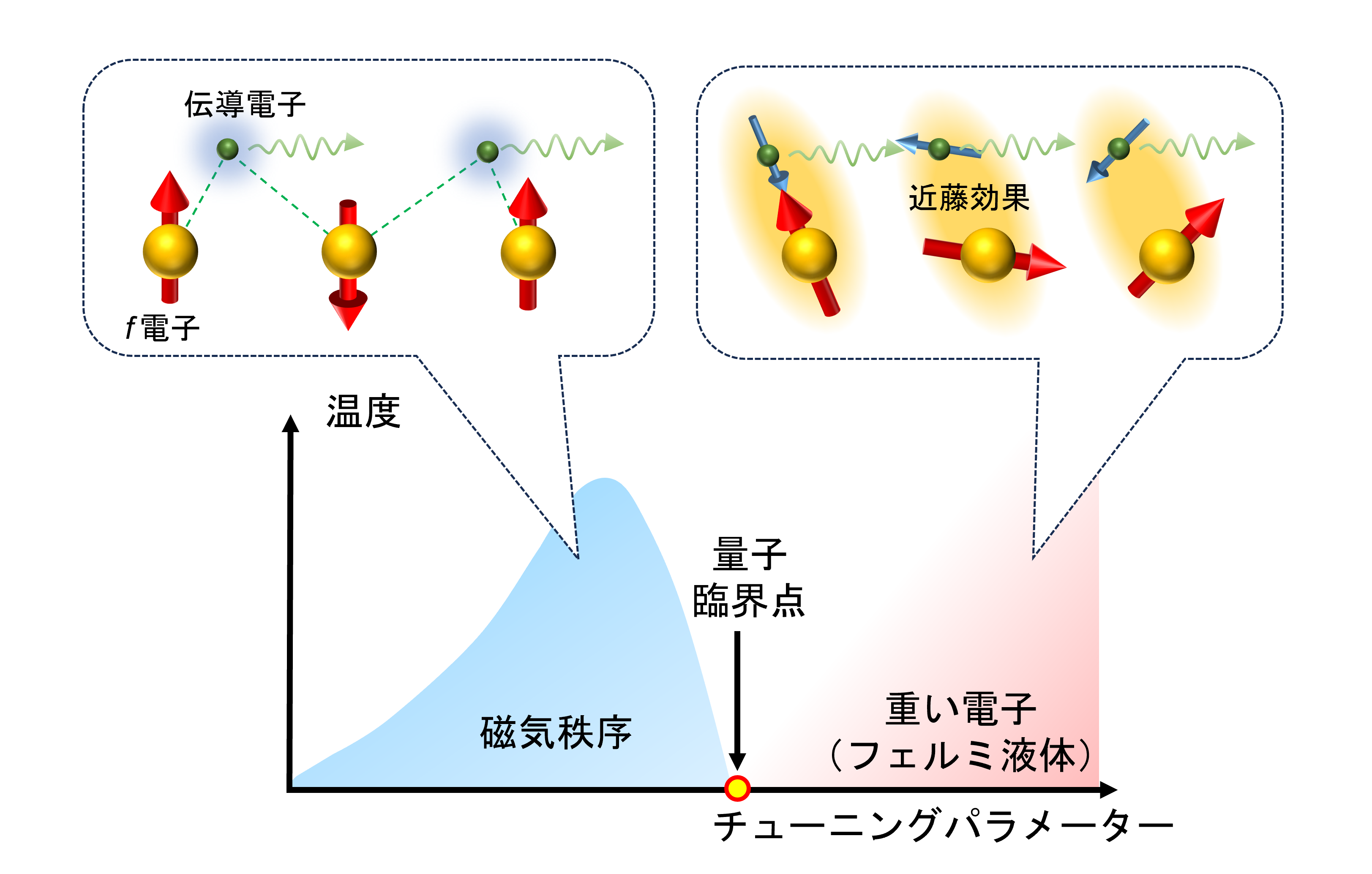 セリウム(Ce)、プラセオジウム(Pr)、イッテルビウム(Yb)のような希土類元素(ランタノイド)や、ウラン(U)のようなアクチノイドを含む金属間化合物では、電子の有効質量が自由電子の数百倍以上にもなることがあります。そのような特異な物質群は「重い電子系」とよばれます。重い電子が形成される主要なメカニズムとして、局在したf電子と伝導電子が低温で量子力学的に強く混成し、局在f電子のスピンが遮蔽される近藤効果が重要だと考えられています。重い電子系では、スピンを揃えようとする磁気秩序と、スピンを遮蔽しようとする近藤効果が競合します。この競合は、圧力・磁場・化学置換といったチューニングパラメーターを変えることで制御できます。これらのパラメーターにより磁気転移温度を連続的に抑制し、絶対零度で消失する点を「量子臨界点」と呼びます。量子臨界点近傍では熱ゆらぎによって支配される通常の相転移と異なり、量子力学的相互作用の拮抗による量子ゆらぎが支配的となり、物理量に非自明な温度依存性・パラメーター依存性(非フェルミ液体的挙動)が現れます。さらに、量子臨界点近傍ではしばしば電気抵抗がゼロになる超伝導が現れます。この超伝導は電子間引力に磁気ゆらぎが関与する非従来型超伝導である可能性が高く、現在も重要な研究テーマとなっています。