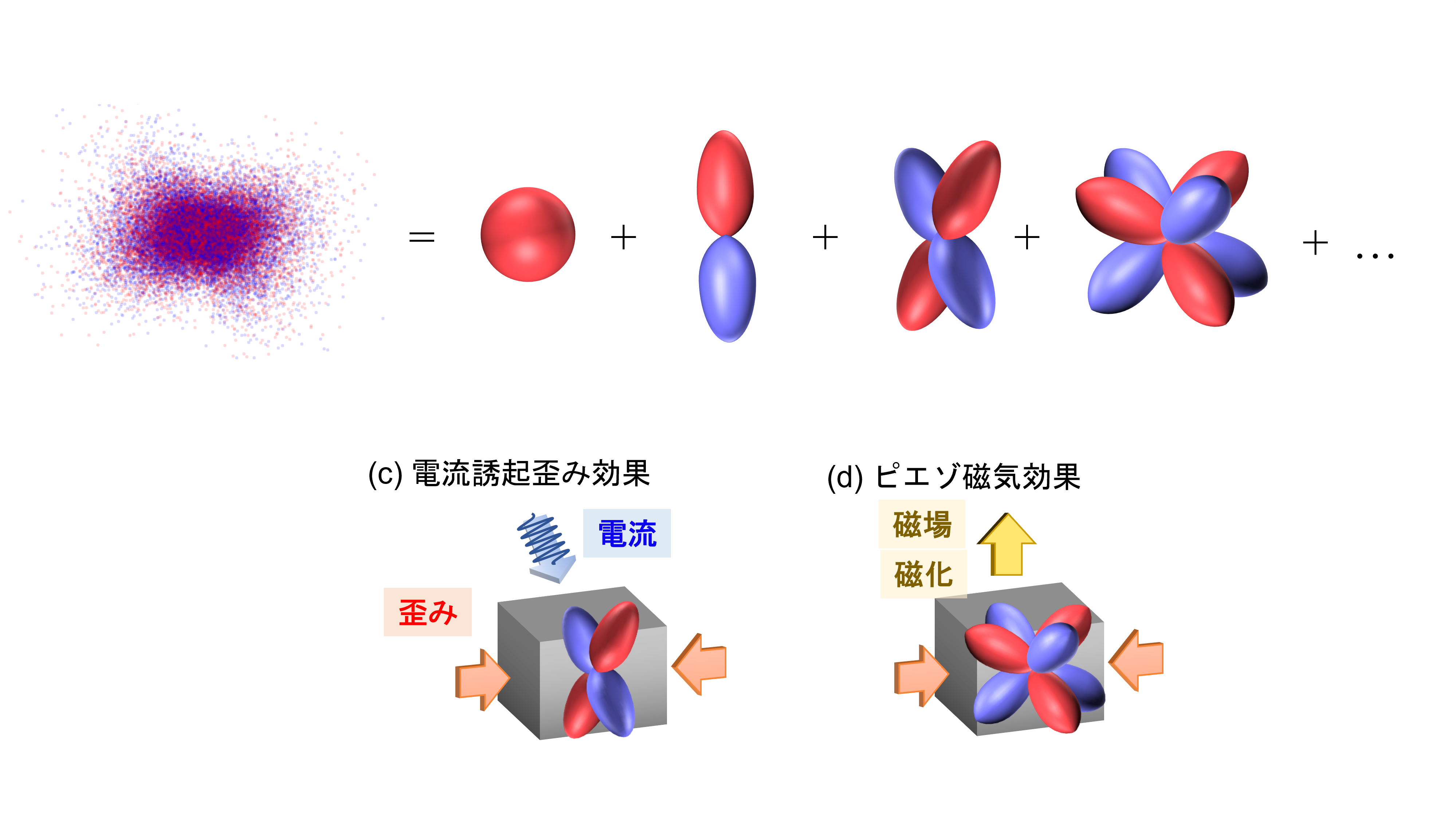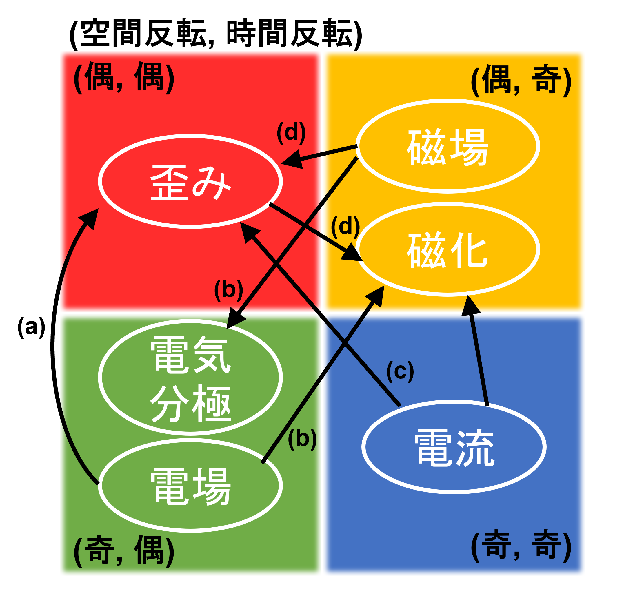 多極子(単極子、双極子、四極子、八極子…)は、もともと古典電磁気学において、空間中の電荷分布や磁荷分布の異方性を表すために導入された概念です。しかしこの考え方は、電子のようなミクロなスケールからなる量子力学の世界に対しても適用することができます。 近年では、異なる対称性を持った物理量の間に応答が生じる「交差相関応答」が注目を集めています。例えば、図に示した(a)ピエゾ電気効果、(b)電気磁気効果、(c)電流誘起歪み効果、(d)ピエゾ磁気効果などがその代表例です。これらの交差相関応答について、結晶中の電子状態を多極子によって特徴づけることで、対称性の観点から統一的かつ普遍的に理解する研究が進んでいます。一般的に多極子は、時間反転対称性(時間$t$を$-t$に変換したときの性質)と空間反転(パリティ)対称性(空間座標$(x, y, z)$を$(-x, -y, -z)$に変換したときの性質)に応じて、電気多極子、磁気多極子、磁気トロイダル多極子、電気トロイダル多極子の4つに分類されます。我々は、磁気四極子などの奇パリティ磁気多極子系で現れる(c)電流誘起歪み、磁気八極子や磁気トロイダル四極子などの偶パリティ磁気多極子系で現れる(d)ピエゾ磁気効果に興味をもって研究を進めています。