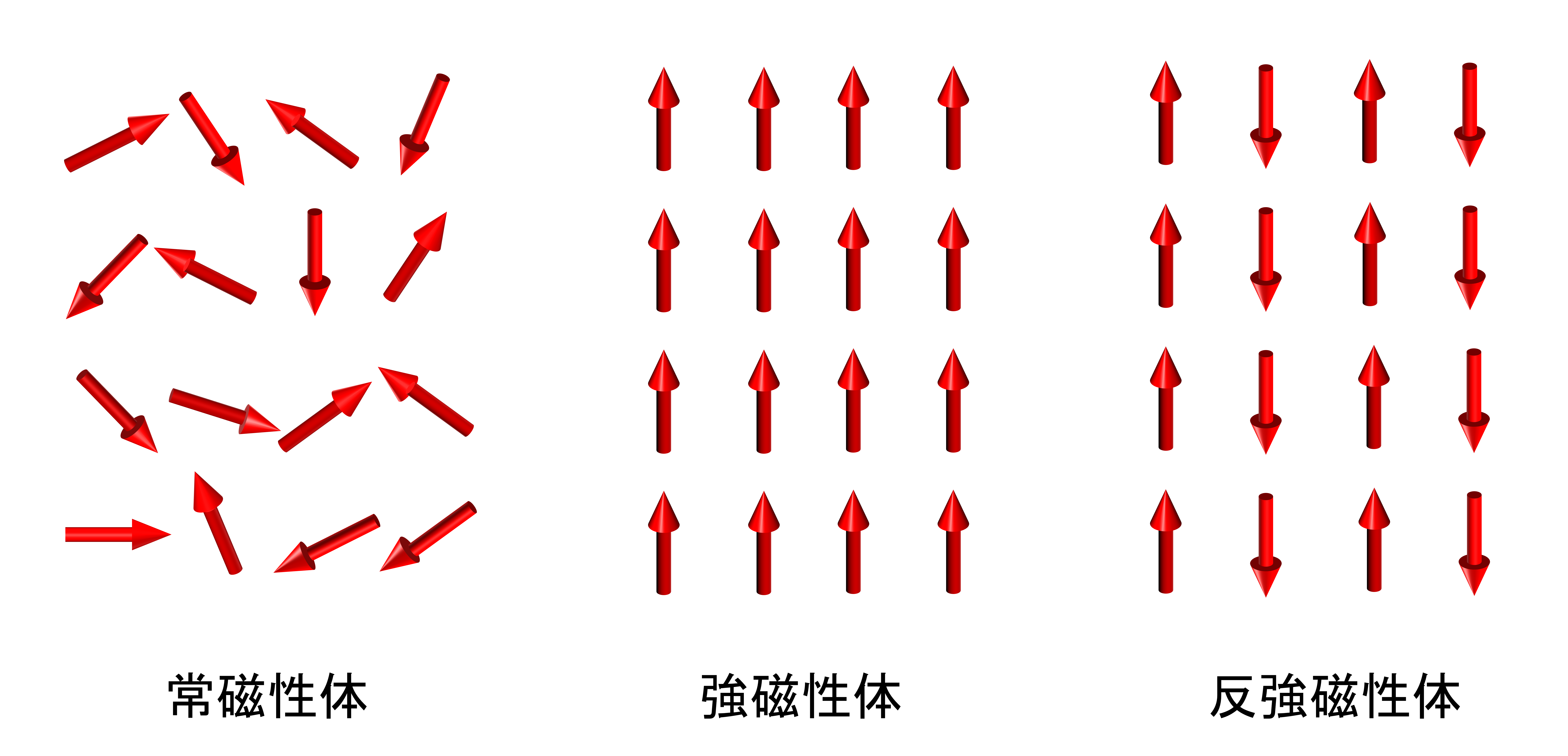 モーターやスピーカー、ハードディスクなどの我々の身の回りの至る所で使用されている永久磁石は、現代社会を支える必要不可欠な機能性材料の1つです。一見、単純に見える磁石の性質(磁性)ですが、その起源は電子がもつスピンという量子力学的自由度にあります。物質中でスピンの向きが自発的に揃うと、「強磁性体」と呼ばれる状態になり、これが永久磁石の正体です。その他にも、一方、スピンがばらばらに向いた「常磁性体」や、隣り合うスピンが反対方向を向く「反強磁性体」など、世の中にはさまざまな磁性をもつ物質(磁性体)が存在しています。我々は、そうした磁性体の背後にある物理法則を研究しています。