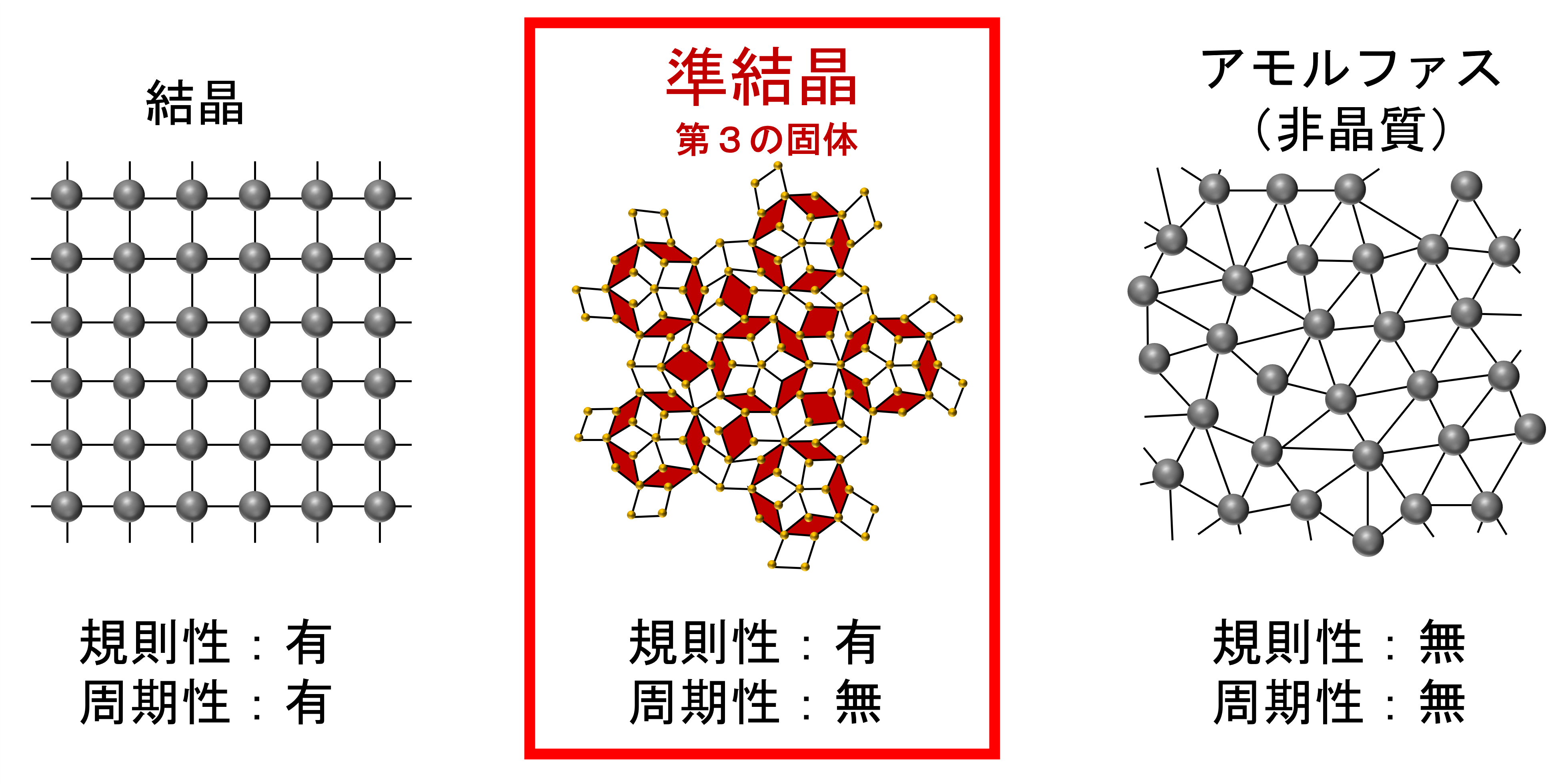固体はこれまで、結晶(周期的な構造を持つ)とアモルファス(ランダムな構造を持つ)に分類されてきました。しかし1984年にD. Shechtmanらによって発見された「準結晶」は、これらとは異なる「第3の固体」として世界中で注目を集めています。準結晶は、図のように並び方に一定の規則性があるものの、周期性を持たないという「準周期構造」を有します。このため、通常の結晶では禁じられている5回対称性や10回・12回といった高次の回転対称性を示すことができます。こうした従来の結晶学の枠組みを超えた特異な構造に基づく物性の解明が、現在も精力的に進められています。最近では、希土類元素を含む準結晶において長距離磁気秩序が観測され、「周期性を欠く準周期構造においても長距離秩序が実現し得る」ことが明らかになりつつあります。我々は、こうした準周期性と磁性の関係に関心を持ち、磁性準結晶の新しい物理の探索を行っています。